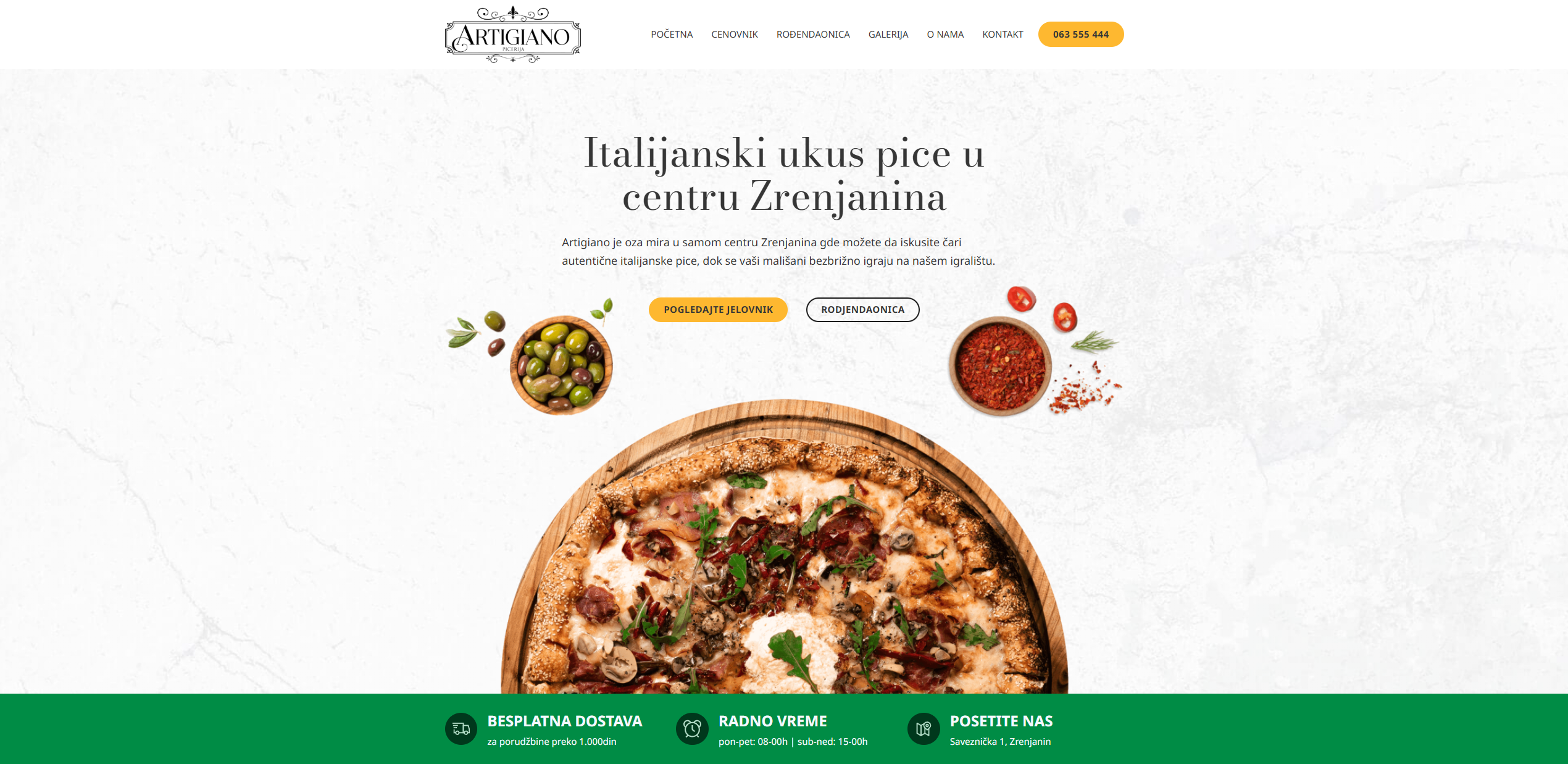A modern, user-friendly site for Artigiano Pizzeria showcasing its delicious menu and inviting atmosphere. Features include high-quality images and a responsive design for mobile devices.